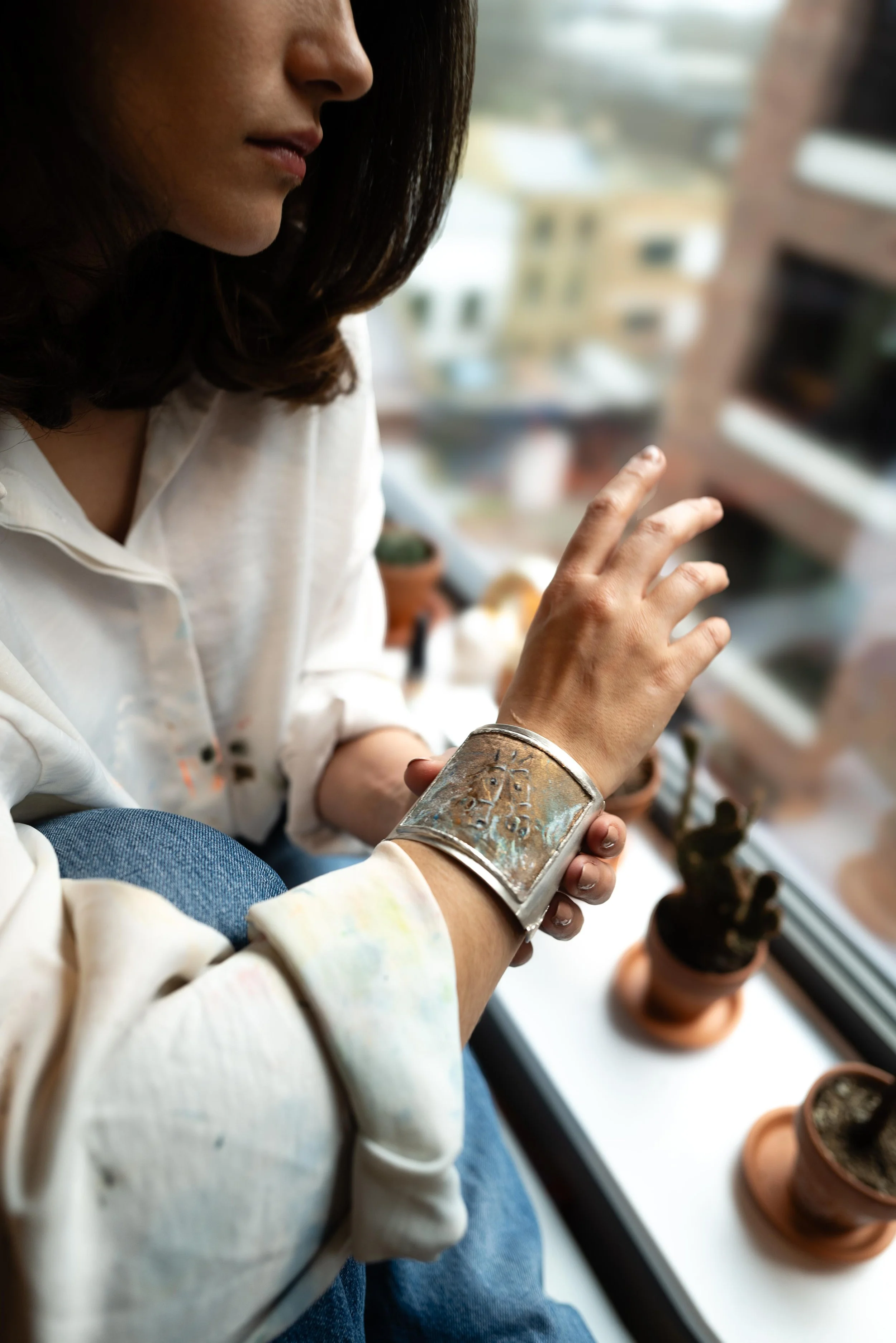 And myself, I created the cuff around the painting in etched solid Silver metal.
